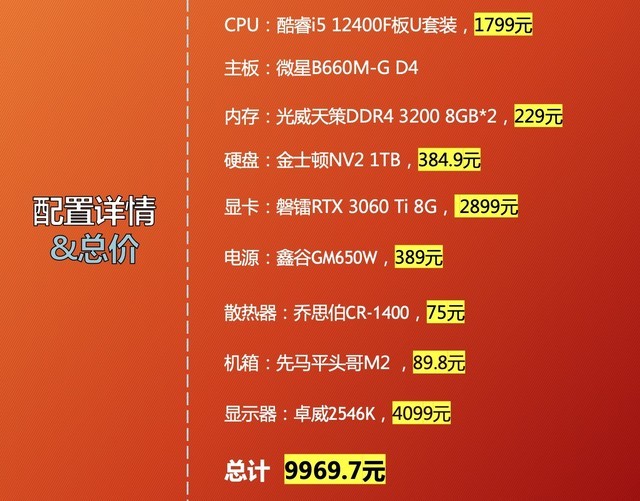 下面是详细的装机清单,核算总价为9969.7元,完全符合预算。