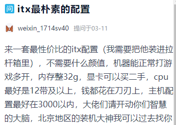 ITX小整机是近年来逐渐流行的趋势,它更小巧便携,美观度也更胜一筹。但价格较高、搭配难度较大一直困扰着玩家,今天来分享一位题主的3000元攒ITX整机。