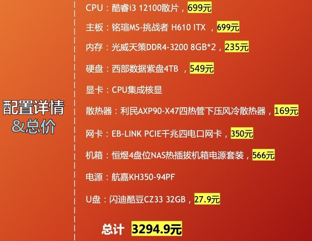 All in one NAS硬件配置,最后核算总价,3294.9元,一台12代酷睿i3平台的All in one NAS就组装好了,接下来给U盘安装好Unraid系统就可以使用了。