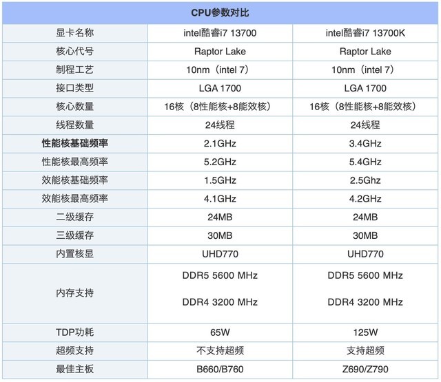 从上图可知,酷睿i7-13700的性能核基础频率为2.1GHz,睿频最高可达5.2GHz,效能核基础频率1.5GHz,最高可达4.1GHz;而i7-13700K性能核基础频率为3.4GHz,睿频最高可达5.4GHz,效能核基础频率2.5GHz,最高可达4.2GHz。也就是说,i7-13700K在不超频的情况下就拥有更高的基础频率,如果超频的话性能会进一步的提升。