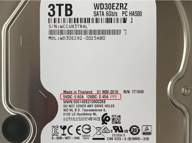 然后就是存储设备,先看机械硬盘。通常厂商在标签上都会标注详细的信息,包括容量、转速和缓存大小等,主机电源选购,同时也会标注工作电压和电流,例如下面这款西部数据的3TB的3.5寸机械硬盘,它有12V和5V两组电压输入,电流分别是0.45A和0.6A,因此它的总功率就是8.4W。