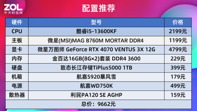 整套平台售价9662元,预算大头在显卡,选择了最新推出的RTX 4070,觉得预算过高的用户可以考虑30系或者等等将推出的4060Ti。