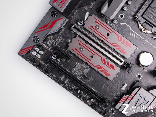 另外还有两条M.2高速接口,都带有金属散热装甲,可以把SSD装好之后使用金属散热片进行辅助散热,标称两个接口都可以使用SATA III和NVMe协议的硬盘。