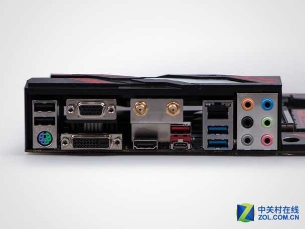 这款主板I/O区域接口丰富,PS/2键鼠接口,USB2.0 3.0 3.1,Type-A/C都有,视频输出VGA,DVI,HDMI俱齐,另外还配置了Wi-Fi天线接口,搭配包装中附带的天线流畅使用Wi-Fi网络,另外还配置了千兆网络有线网络接口和一组高清音频输出。