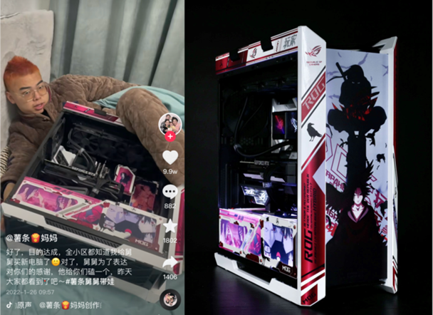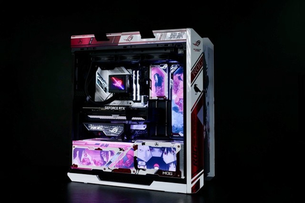 在当下信息爆炸的时代,大家受到全方位多元文化的熏陶,喜好追求个性化,以彰显自己的独特。所以,电脑主机也摆脱以往刻板印象,更多的定制化PC已成为玩家们的新选择。近日抖音达人薯条妈妈的新电脑也是火出圈,从视频中可看出其采用的是ROG全家桶,以火影忍者为主题进行深度定制,外观十分炫酷!同时性能也与机箱上的宇智波鼬一般战力非凡,以Z690吹雪主板为核心搭配ROG3080显卡等一系列配件,让你无论是忍界还是电竞世界主宰一切!