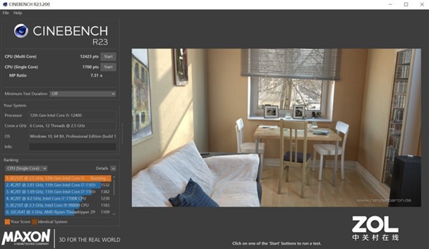 CINEBENCHR23的测试中,酷睿i5-12400多线程得分为12423,单线程达到了1700,已经发挥了这款处理器的实力。