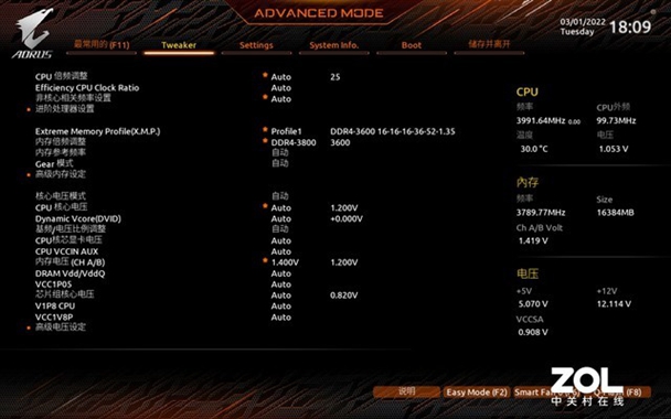 高级菜单可能调校查看其他硬件状态,CPU核心以及PCIe通道也能在这里设置。