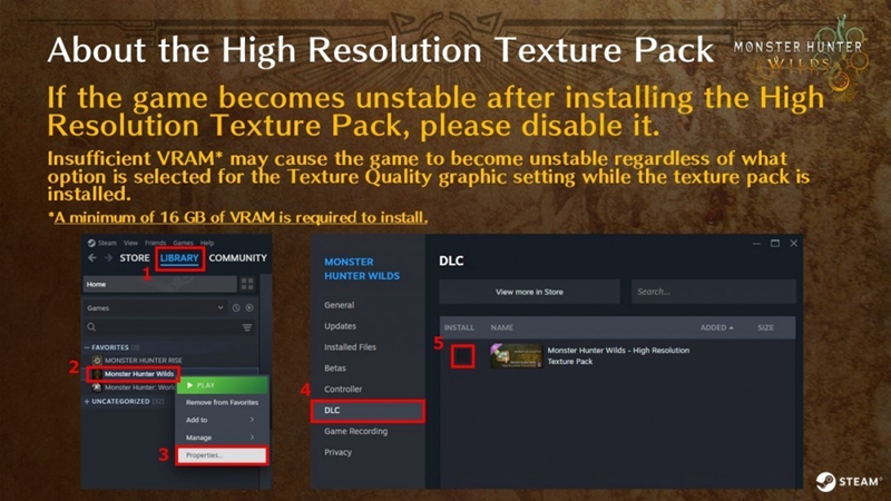 首先,在Steam客户端左上角的菜单中选择“库”,然后右键点击“怪物猎人:荒野”游戏,依次选择“属性”和“DLC”。在DLC列表中找到“Monster Hunter Wilds - 高分辨率贴图包”,取消勾选“安装”选项中的复选框。最后,重启Steam客户端以确保设置生效。