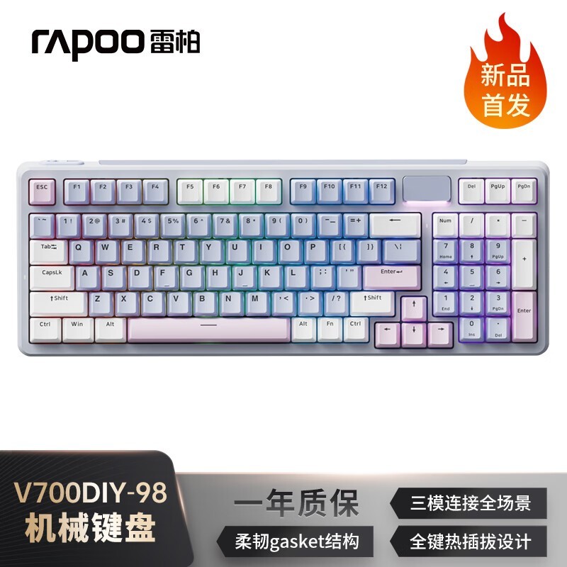 雷柏 V700-98无线机械键盘是一款非常出色的键盘。雷柏 V700-98具备有线蓝牙三模连接方式,能满足不同设备的连接需求。雷柏 V700-98采用gasket客制化设计,7层填充消音,在使用时能有效减少按键产生的噪音,营造安静的使用环境。雷柏 V700-98全键热插拔功能让用户可以根据自己的喜好自由更换轴体,无论是电竞游戏还是日常办公使用都非常合适。而且它还有蓝灰粉的配色,颜值很高。