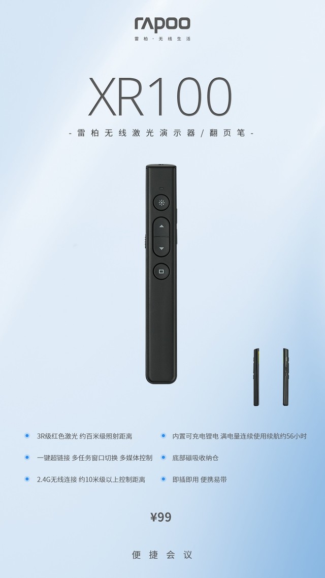 雷柏推出了XR100无线激光演示器/翻页笔,2.4G的无线连接,拥有约10米级以上的操控距离,3R级红色激光,提供了约百米级的照射距离,内置可充电锂电,满电量连续使用则能达到56个小时。一键的超链接,多任务的窗口切换加上底部的磁吸收纳仓以及即插即用,便携易带这些点,无疑就是一个职场PPT达人们会议上必备的好帮手,现99元正式上市。