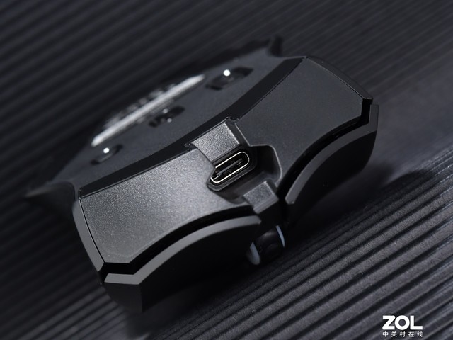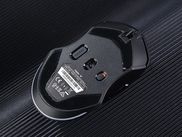雷柏 V20W前端设置了USB Type-C接口,我们可以通过它进行充电,或连线使用。鼠标底部提供了无线接收器收纳槽,防止2.4G无线接收器丢失。此外,鼠标底部还设置了两块大面积的特氟龙脚贴,可提升鼠标的通过性。