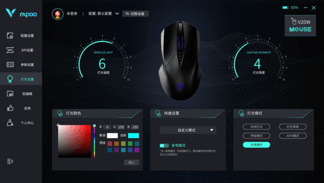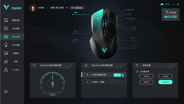 雷柏 V20W依旧支持雷柏官方驱动,通过驱动软件,我们能够调节DPI数值、按键功能、灯效模式并录入宏命令。它的驱动页面逻辑比较简洁,所有常用功能设置都在第一界面上,而无需繁琐的查找。它的DPI页面支持DPI档位、数值调整,可支持以50DPI为步进进行调节,最高可设置到16000DPI。