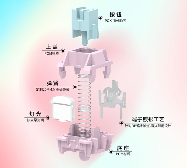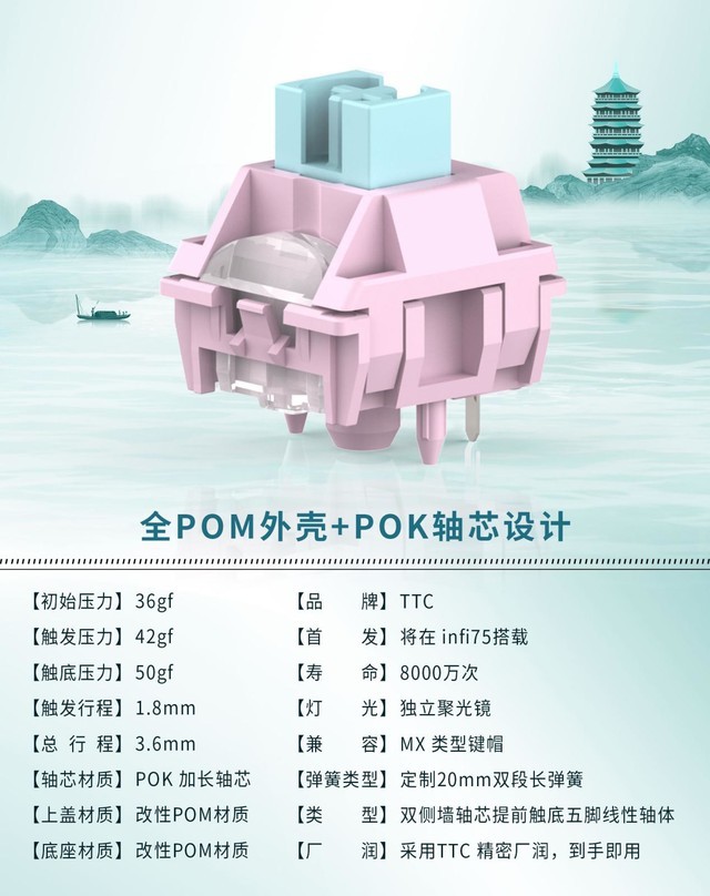 TTC 西子轴,采用全POM外壳+POK轴芯方案,POK材质拥有超耐磨低噪音的特性,POM拥有自润滑特性,因此,这个方案在顺滑度和声音表现都有非常好的表现。