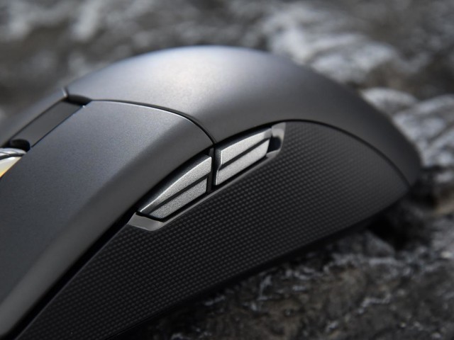 漫步者 G4M Pro侧键部分,它的侧键手感一致度方面的表现不错,但由于键程稍长,且存在一定的空键程现象,这款鼠标的侧键手感也略显偏软。侧键的位置和大小合理,以笔者右手型用户的使用习惯为例,这款鼠标的侧键可以轻松找到并按下,并且不容易误触,可以为游戏操作提供不错的体验提升。此外,这款鼠标在侧裙部位设置了大量的防滑纹理,即使不使用防滑贴,它的防滑效果其实也很不错。此外,官方也为其配备了一套防滑贴,能够覆盖鼠标的主键部以及后盖,我们可以按需使用,握持更加稳固。