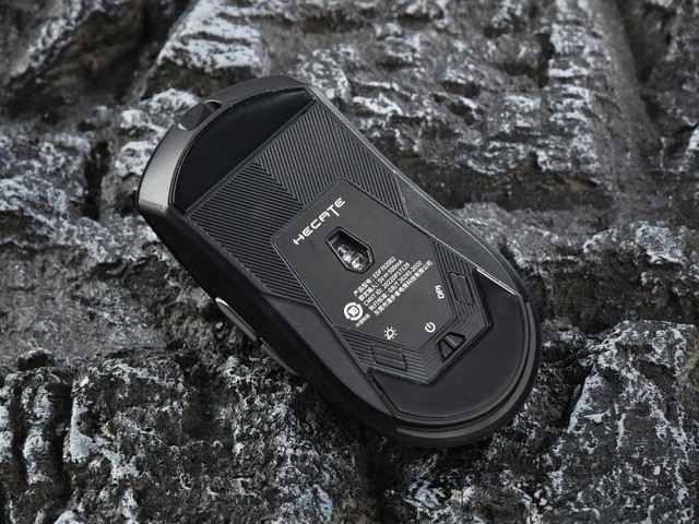 漫步者 G4M Pro鼠标底部也设置了一定的装饰纹路,并配备特氟龙脚贴。此外,我们还可以找到灯效开关、电源开关以及DPI切换按钮,一键式调节,非常方便,也是目前部分高端游戏鼠标喜欢使用的方案,避免了在使用过程中的误操作现象。
