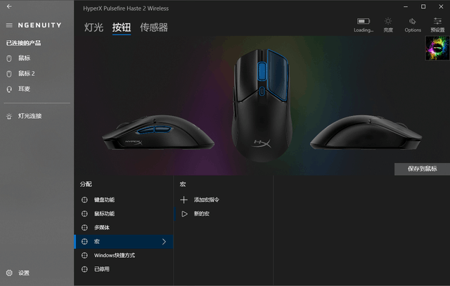 HyperX 旋火2鼠标支持HyperXNGENUITY驱动。这款驱动可设置灯光、按钮、传感器,还可以显示鼠标电量,调整灯光亮度、切换配置文件等。灯光界面中能够调整灯光模式,如呼吸、循环或者纯色,这款鼠标支持1680万色RGB背光调节,所以我们可以在调色板中调节多个自己喜欢的颜色。鼠标依旧只有滚轮一个发光区域,在视觉上看上去没那么单调了。
