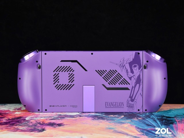 OneXPlayer 2Pro EVA联名限量版三合一电脑游戏机整体采用了EVA初号机的配色风格,机身全部采用紫色涂装并且丝印一些EVA有关的DIY元素。产品尺寸长310mm,宽127mm,高23mm,是一款偏大的游戏机,倒是挺符合初号机巨型机体的设定。
