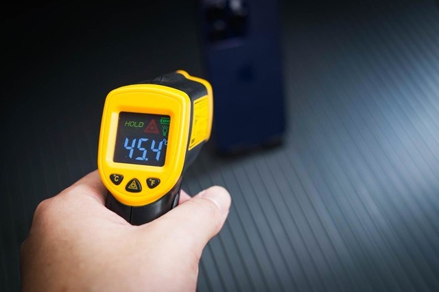 可以看到测温枪此时显示的最低温度为6.7度,表现非常优秀;但这终归是理论测试,具体应用到手机或者平板上能降温多少还要看手机材质、接触面大小以及主板设计,为了让大家更直观的看到差距,笔者将同一款手机分别运行一款游戏一小时,测试带散热器和不带散热器结束时的手机温度。