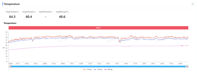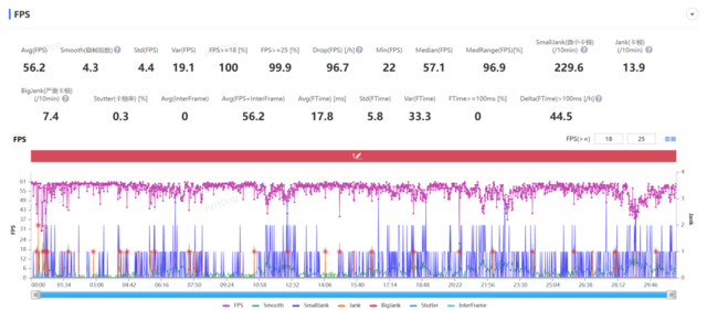 在室温25度的环境下,不使用散热背夹游玩半小时原神,通过性能狗采集游戏帧率,可以看到帧率全程都比较不稳定,19分钟时还出现了明显的掉帧现象;且随着游玩时间增加,手机温度也越来越高,电池平均温度超过了40度。