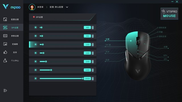 按键布局来看,雷柏 VT9PRO双模无线游戏鼠标算上滚轮上下两个按键后,总共有9基础功能键+1个DIY按键,都能进行自定义设计,根据自身使用习惯去调整就行。