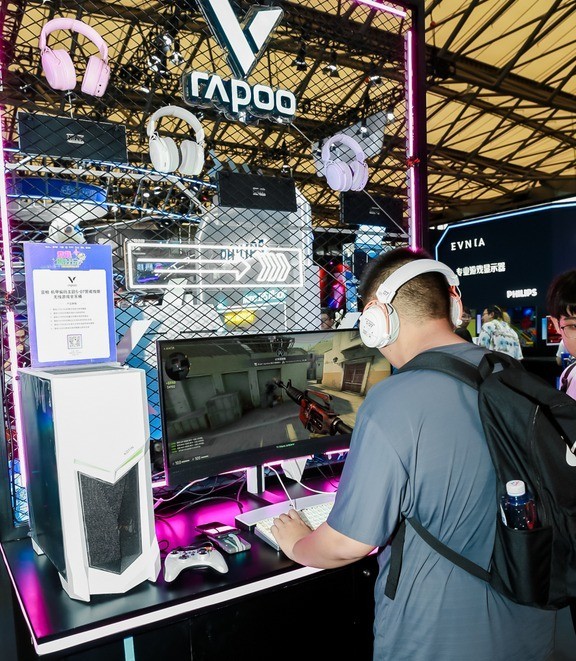 本次ChinaJoy,雷柏为观众带来的“全家桶”可谓名副其实,展台的两台高能游戏PC均配备了V700-8A多模无线游戏机械键盘、VT9 PRO轻量化双模无线游戏鼠标、VH800双模无线RGB游戏耳机、VH10RGB律动幻彩游戏耳机支架等产品。