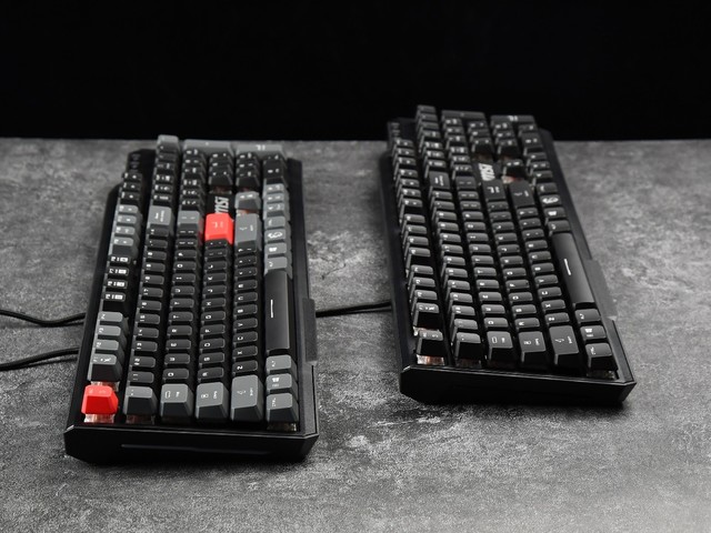 微星VIGOR GK41(右)和GK41DUSK(左)两款键盘的区别集中在RGB效果和键帽上。微星VIGOR GK41的RGB背光为6种固定LED灯光,分布在10个不同区域;键帽为黑色;微星VIGOR GK41 DUSK则支持单键RGB,支持Mystic Light,并且两侧有RGB灯条;键帽为黑灰混搭,ESC和ENTER为红色,并且附赠一组键帽。很明显,微星VIGOR GK41 DUSK更注重客制化,当然,售价也要更高一些,为499元。微星VIGOR GK41同样有着不错的综合素质,售价为399元。目前两款产品均已上架天猫微星旗舰店。