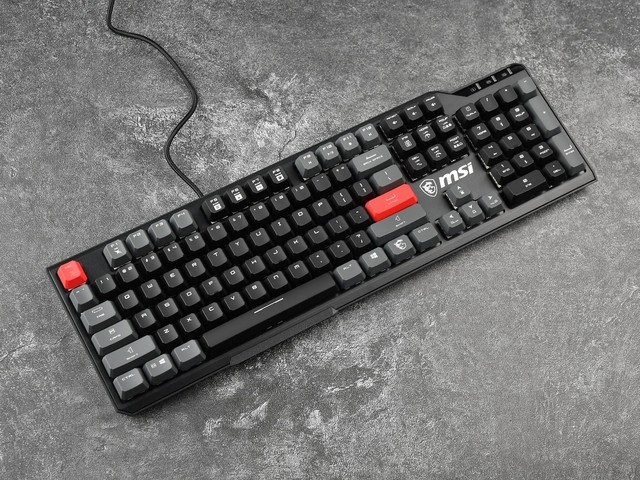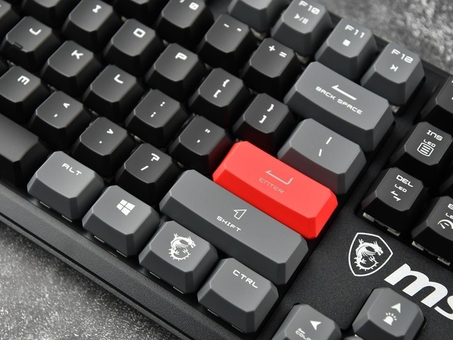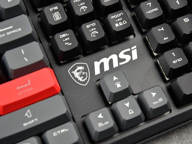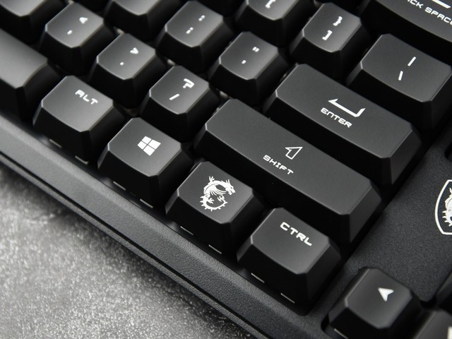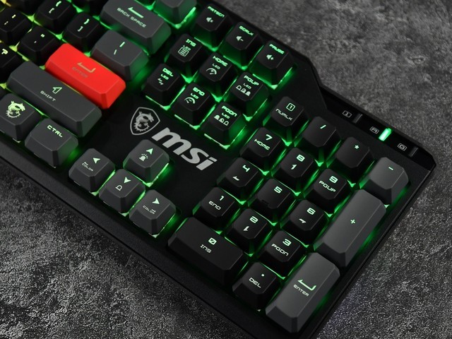 键盘本体所用的材质为塑料,表面有比较明显的磨砂感。键盘本体的刚性是不错的,大幅度按压也不会产生明显形变,按键的承托性还不错,耐用性不用担心。右上角为3个按键状态指示灯,这一部分为亮面处理。方向键的上方印有微星的Logo。
