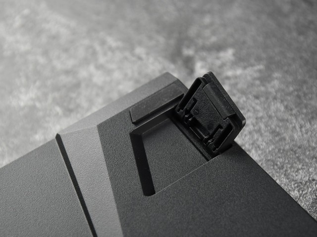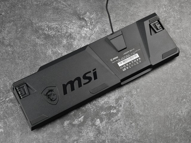 键盘底部的视觉元素会比较多一些。微星的logo位于底部左侧,再加上右侧梯形凹陷设计,视觉上不会单调。两侧靠上位置有折叠支撑脚垫,可提供0°、3°、7°三种不同倾斜角度,满足不同玩家的使用需求。五个防滑脚垫也能保证键盘不容易出现位移。