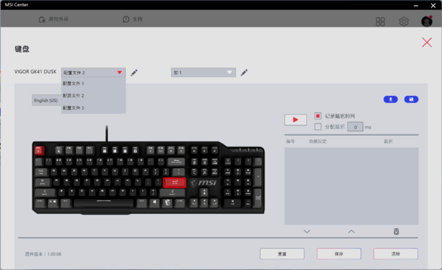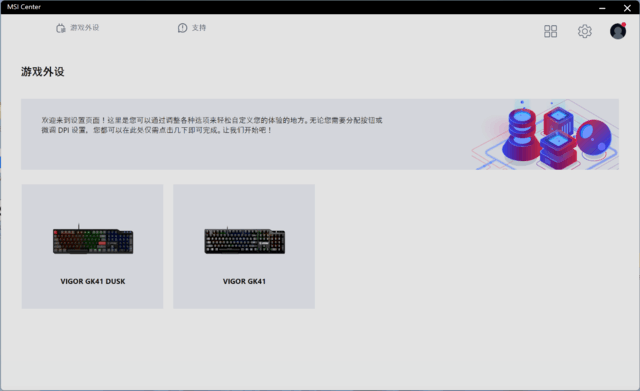在MSI Center的游戏外设模块下,就可以看到微星VIGOR GK41系列键盘,点击键盘即可对键盘的配置文件、宏进行设置。