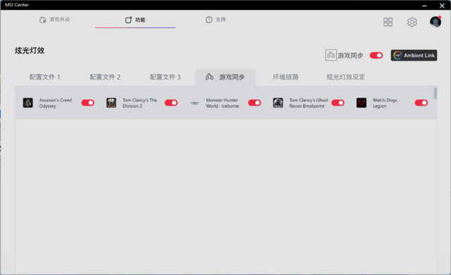 在功能模块下的炫光灯效(Mystic Light)下,可以更改不同配置文件对应的灯效,操作非常简单,只需要点选即可。另外还可以开启游戏同步功能,实现游戏状态与灯效同步,游戏沉浸感更优秀。