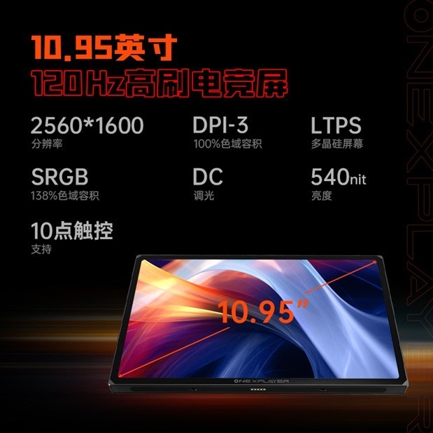 屏幕上,一号游侠X1采用10.95英寸LTPS多晶硅屏幕,支持10点触摸和4096级压感原笔迹手写,超清分辨率2560*1600,刷新率120Hz,亮度540nit,DPI-3 100%、SRGB 138%的高色域体积保证了色彩的真实还原,使每一幅画面生动华丽;屏幕比例为166,最适合Windows系统操作。:同时采用DC调光技术不闪屏,能给用户带来更加精彩的视觉体验。
