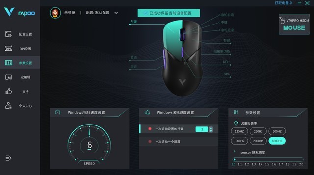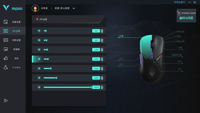 这款鼠标可以通过雷柏RapoogameDev的独家驱动进行更深入的调整,支持智能云存储,通过账号上传自己的配置,在任何计算机上找到自己的配置,避免繁琐的重复设置操作。在DPI设置页面中,该鼠标可以调整至多7个DPI档位,并设置值,并支持50个DPI步进调整。