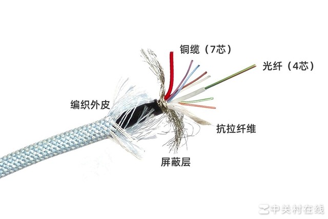 USB4 AOC的结构分为光路和电路两部分,光路部分负责USB4、USB3.与DisplayPort1.4达成高速协议,电路部分负责USB2.00、光路系统供电和各种快速充电协议。从电线的解剖图来看,最外层是编织皮革,内层是橡胶材质,内部金属屏蔽网包裹7芯快充/供电/低速协议铜缆和4芯USB4/USB3.2/DP1.4高速光纤,可说是真正的“光铜融合”。