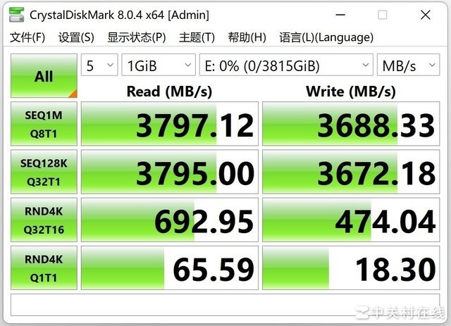 鉴于USB4 AOC的特点,我们从数据传输、视频信号传输、快速充电三个功能进行综合测试。我们使用USB4测试。 Type-联想小新PRO14笔记本电脑,ASM2464主控芯片USB4移动硬盘盒+致态TiPlus7100。 PCIe4.0 NVMe M.2 1TB固态硬盘。通过Crystal Disk 读写速度为3797.12MB/s和3688.33MB/s的Mark测试s,达到USB4传送带宽标准。