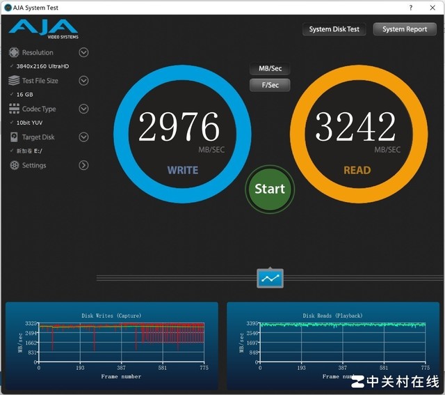 AJA System Test是一款根据数字视频制作要求开发的测试软件,通过模拟写入和读取视频文件的过程,可以快速评估存储设备的性能。该软件设置16GB文件大小,3840x2160 10bittraHD分辨率实际测试读写速度为3242MB/s和2976MB/s的YUV编码格式s,同样符合USB4的性能标准。