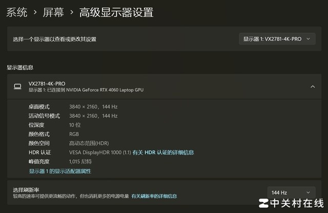 下一步是视频信号传输测试。这个USB4 支持DP1.4标准的AOC,最高可支持4K。 144Hz/8K 视频信号60Hz。实际测试,联想拯救者Y9000P游戏笔记本连接VX2781-4K-PRO显示器,并配有RTX4060独立显卡,完美输出4K。信号144Hz,并且打开了高动态范围(即HDR)。