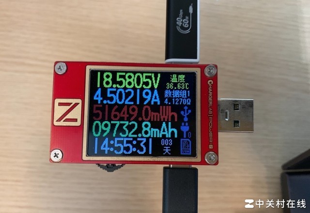最后是快速充电测试。我们用航嘉100W氮化邈PD充电器给联想小新PRO14笔记本充电,用POWER-Z测试仪监控充电情况。尽管这个USB4 AOC标称支持60W快速充电,但POWER-Z显示充电电压/电流达到18.5。V 4.5A,功率高达83.3W!可以看出其内部的铜材料非常真实。