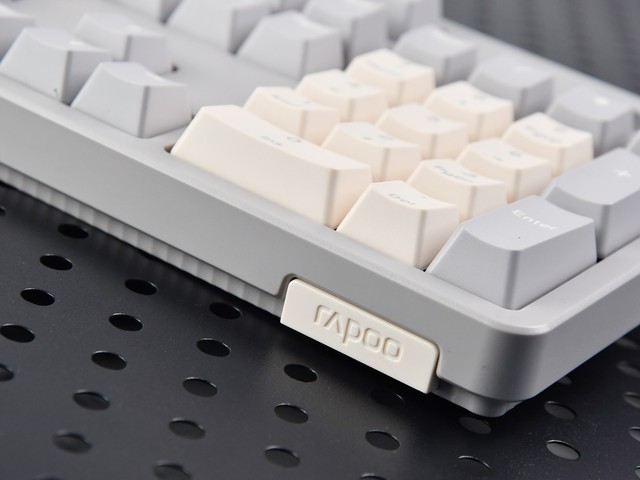 在细节方面,键盘前右下角有一个凸起,上面印有雷柏的标志。键盘左侧也有凸起设计,表面有斜纹处理。这部分是单独的颜色匹配,“双重拼写”版本是颜色之一,月光白版本是浅蓝色,黑曜石黑版本是亮绿色。这种装饰使键盘在视觉上有一定的层次感。