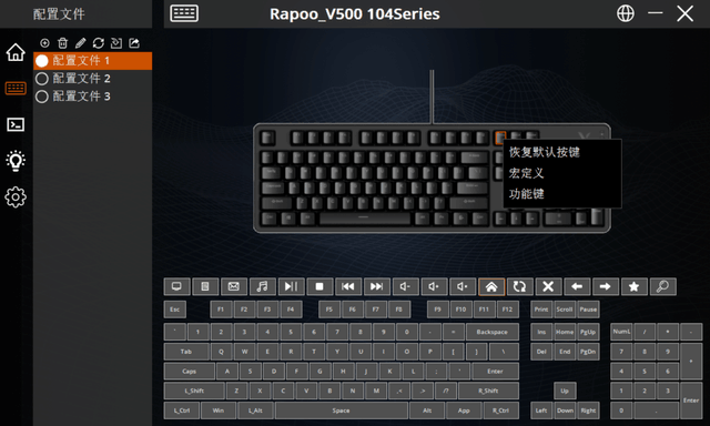 默认情况下,配置文件功能提供3个,用户可自由添加或删除。Fn+默认情况下,F1-F12提供了12种多媒体快捷功能,基本上所有常用的功能都被覆盖。软件除了12种多媒体快捷功能外,还提供了7种浏览器快捷功能,必要时可以自行设置。当然,用户可以定制除Fn以外的任何按钮,设置宏和功能键,例如一键复制,或者一键最小化所有窗口,或者一键通过设置的宏来实现多步操作。