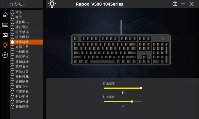 灯光效果方面,雷柏 V500PRO2024版本相当丰富,自由度高。它的键盘背光有20种照明模式和6档亮度,非常丰富,有很大的选择空间。快捷键FN可用于照明模式+PgUp/通过Fn+方向键切换PGDN,通过Fn+方向键切换亮度和呼吸频率。如果不需要灯光,可以通过Fn+Esc关闭(打开)。