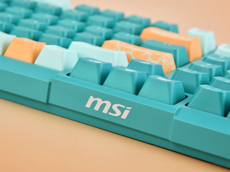 微星 GK500 WIRELESS三模无线机械键盘在配色上提供了白鲨和浮潜两种选择,本次评测的浮潜配色采用了浅绿色和深绿色的搭配,整体的色彩明快,再辅以橙色的点缀,营造出清新脱俗的视觉感受。