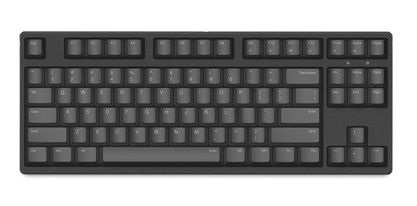 iKBC C87,采用窄边框设计,整体感觉十分简洁。键帽采用PBT材料制造,耐磨且触感干燥稳定;内置原厂CHERRY轴,保证高品质,加厚钢板也能有效阻止PCB高温变形。