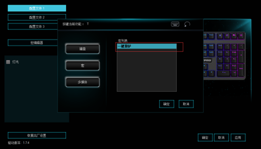 步骤三设置好一键滑铲的一系列动作之后,回到主页面,以T键为例,在设置页面,点击宏,选择刚才设置好的一键滑铲命令,点击确定后,点击应用,即可使用。