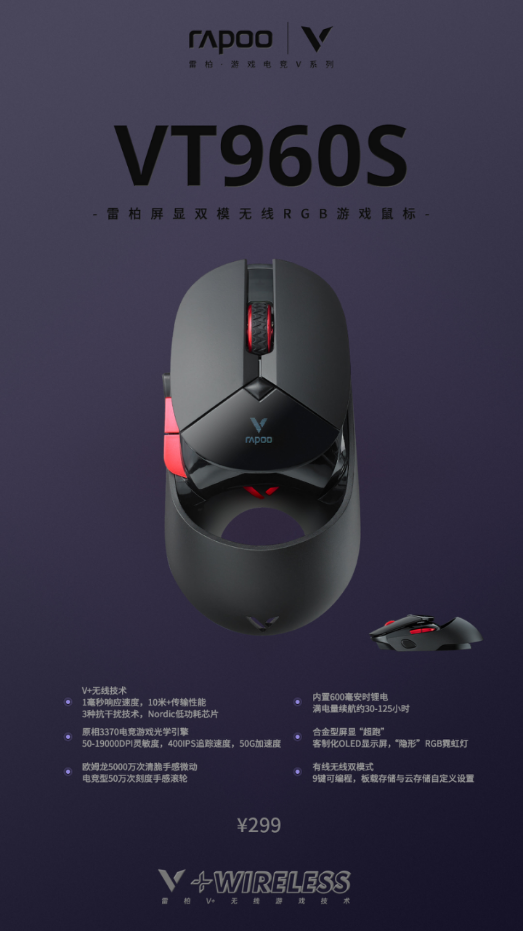 第一款配备雷柏 V+无线游戏技术的无线双模游戏鼠标雷柏 VT960S正式推出,拥有3370光学引擎加持,响应速度1毫秒,最高续航时间125小时。299元自带比快更快的基因,激发无限潜能。