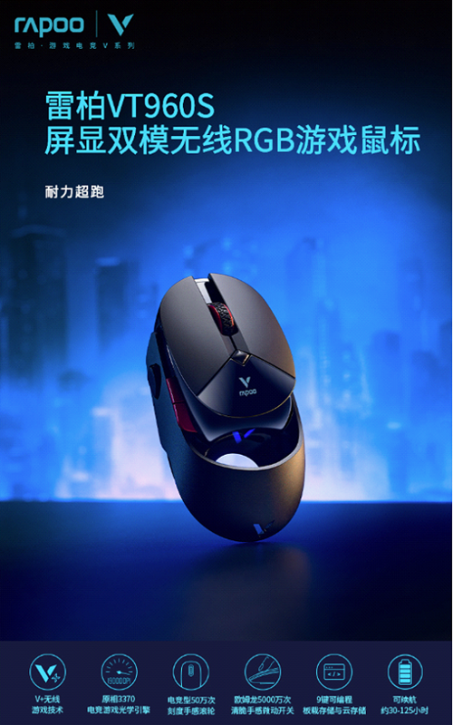 雷柏 V+无线游戏技术,产品实力,品牌实力,硬实力。第一款配备雷柏 V+无线游戏技术的无线双模游戏鼠标雷柏 VT960S正式推出,原相3370光学引擎祝福,1毫秒响应速度,至高125小时续航。接下来,让我们来看看这款299元无限潜力的性能。