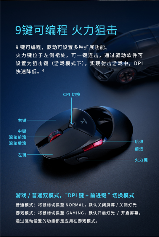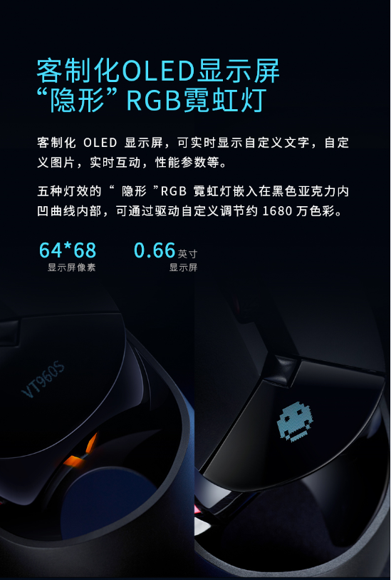 一个0.66英寸的定制OLED显示屏放置在鼠标上方,分辨率为64*68,可以实时显示鼠标的性能状态,让样你就可以实时了解鼠标当前的性能数据,了解自己和敌人,并赢得一百场战斗。同时,该屏幕还可以定制地显示图片、文本等,充分发挥个性呈现。
