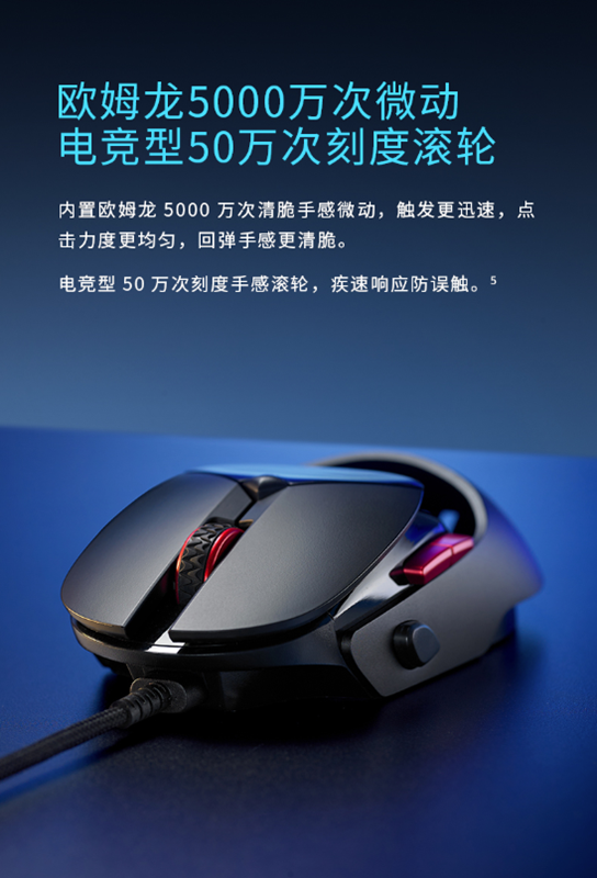 雷柏 VT960S内置5000万欧姆龙微动开关,经久耐用,手感酥脆,反弹快,电子竞技型50万刻度滚轮,快速响应防误触,不用担心鼠标寿命。