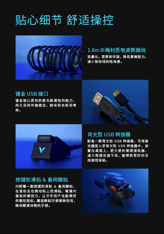 雷柏 VT960S在细节上也实现了更亲密的设备,给玩家更舒适的控制选择。1.8m伞绳电源数据线、镀金USB接口、背光USB转接器、按键防滑贴纸和备用脚贴纸,各种细节让玩家获得更完美的游戏体验,新一代旗舰顶级鼠标雷柏 VT960S值得拥有。