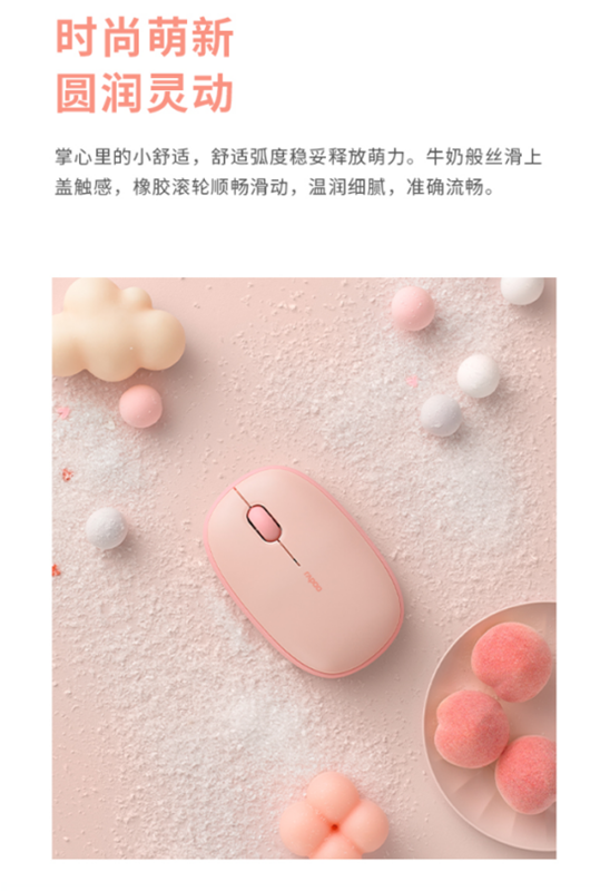 握在手掌心的小舒适,舒适的弧度支撑手掌释放雷柏 M650的可爱力量。牛奶般丝滑的上盖触感,橡胶滚轮的光滑滑动,给白领带来舒适的操作体验。