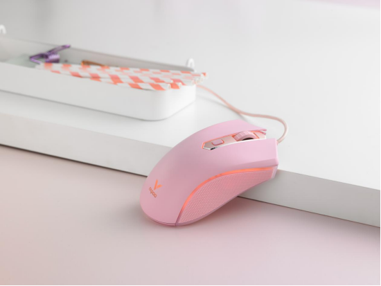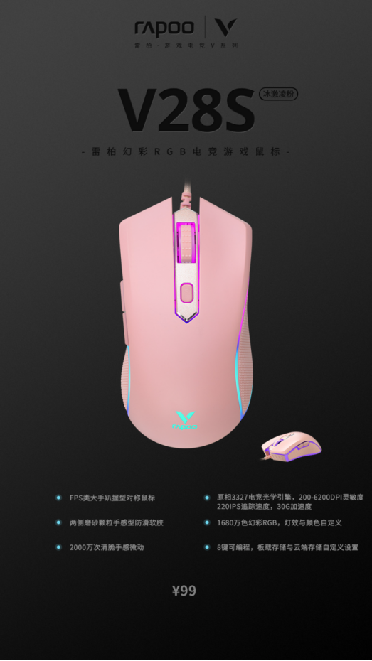 全新冰淇淋粉配色,清爽粉嫩,增添活力,约1680万色幻彩背光,现实中仍能连接彩色引线,左右手对称人体工程学,8键可编程,板内存;雷柏 V28S幻彩RGB电子竞技游戏鼠标冰淇淋粉版上市!